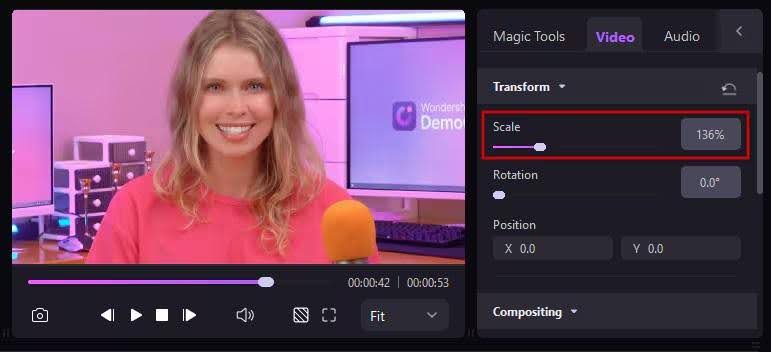 Go to the properties section and drag the Scale slider to the right or left to adjust your video size, as shown below. Alternatively, you can click the video clip and drag the purple-colored frame to adjust the size of your video.