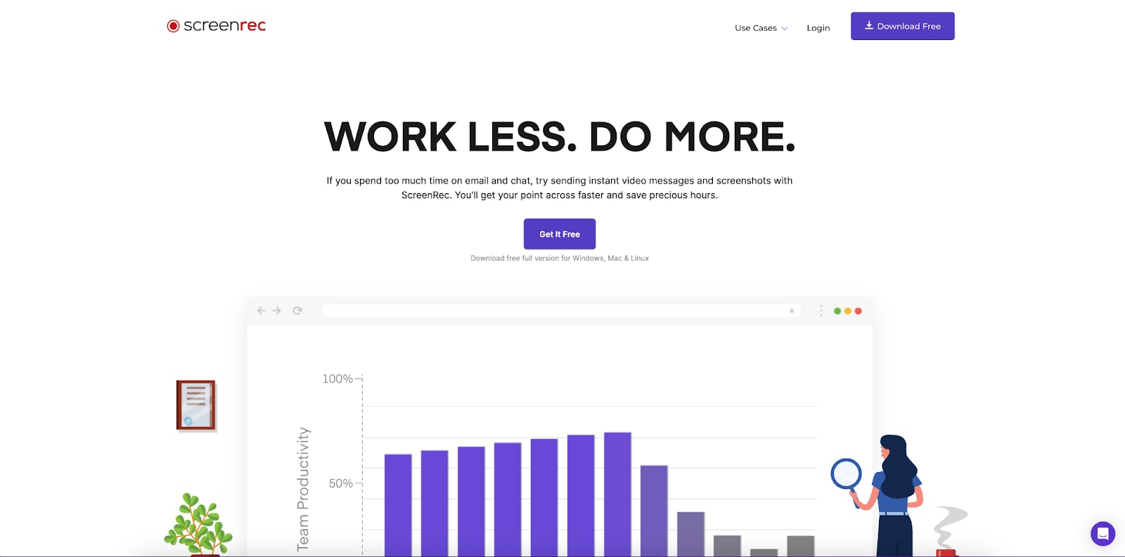 ScreenRec is described as a productivity tool focused on quick recording and sharing of video and audio messages. It offers free recording and downloading with instantly shareable links that are encrypted. It also includes features for webcam recording and capturing system and microphone audio. However, the free version has a five-minute recording limit until an account is created. It lacks video-editing capabilities beyond annotations, and some users have found the annotation toolbar unintuitive. Its primary focus is on rapid communication rather than polished video production.