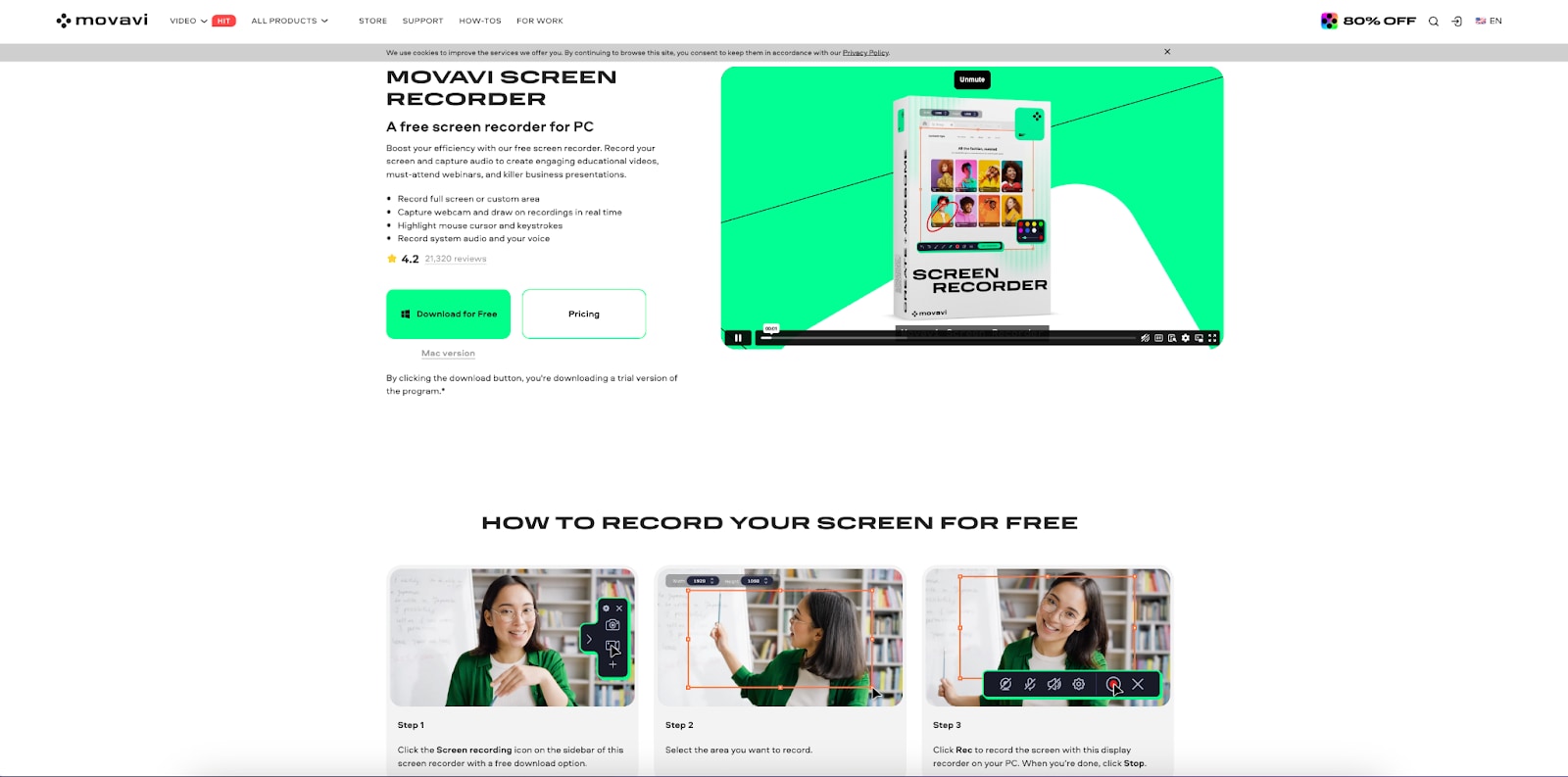 Movavi Screen Recorder is presented as an easy-to-use and affordable screen recorder that can complement the Movavi Video Editor. It's a three-in-one tool offering screen recording, screenshot capture, and webcam recording. It includes basic editing tools and allows users to save recordings in high quality. While it offers a user-friendly interface and features like scheduling recordings and showing keystrokes, some users have found its editing features to be very basic compared to more dedicated video editing software and have reported occasional crashes.